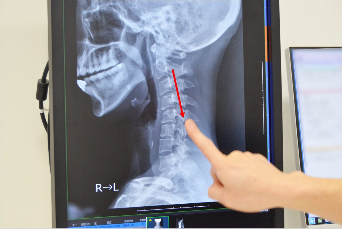 別のレントゲン画像を見てみましょう。本来首の骨はゆるやかに前に曲がっているのですが、こちらの画像では少し後ろに骨が曲がっているのが確認できます。こういうものも頚椎症で、このようにレントゲンでも多くの情報がわかります。