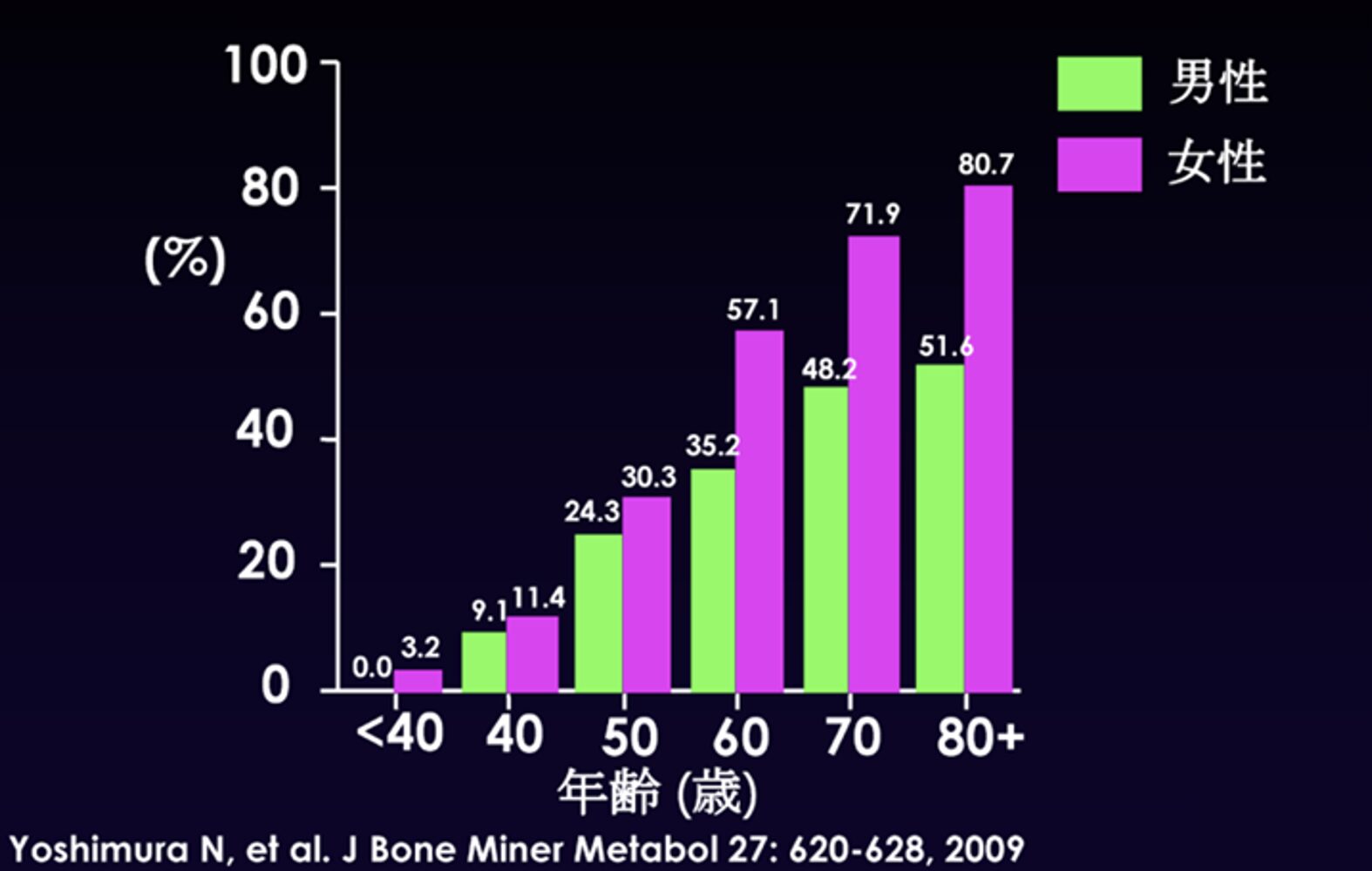 日本では、変形性膝関節症に関連する人は合わせて約3300万人とされ、そのうち痛みを伴う患者さんが約800万人、症状のない関節変化のみの方が約2500万人存在するとされています。40歳以上では男性 42.6%、女性62.4%のかたに変形性膝関節症があり、年齢を重ねるほど、その割合も増加します(図1)。