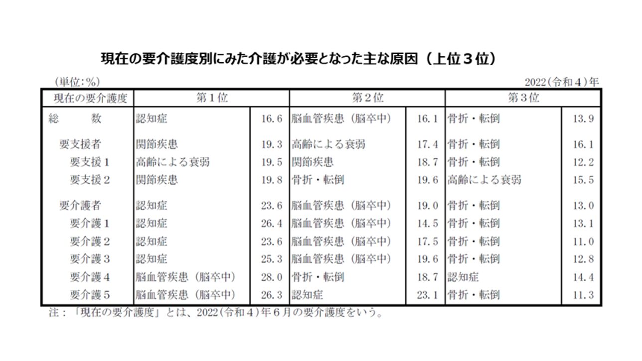 要介護となる原因の約5%、要支援となる原因の約20%が関節症によるものです。要支援の原因としては関節症が疾病の中では最も多いです(図2)。