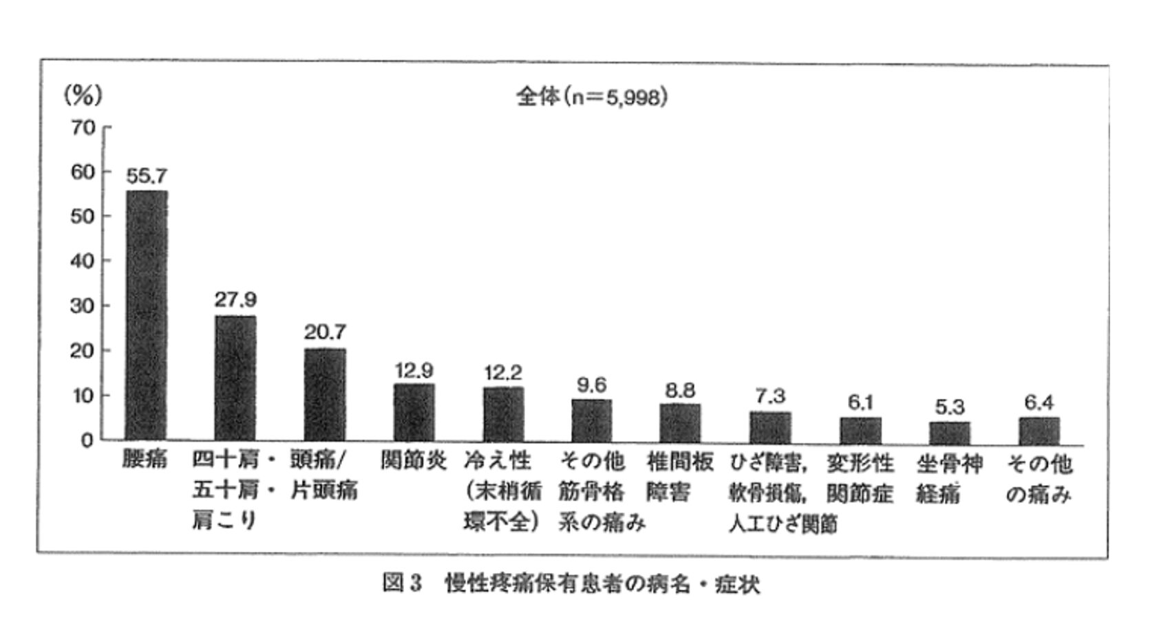 日本における慢性疼痛の有病率は全成人の22.5%(推計患者数は2,315万)に上り、痛みの部位は腰痛や肩が多くなっています。