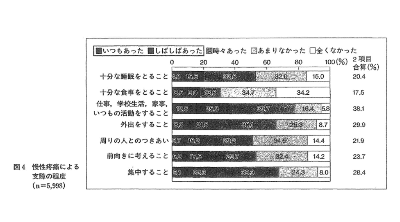 痛みによるADLやQOLへの影響としては、仕事、学校生活、家事などの日常生活への支障、集中力の低下が多いです。