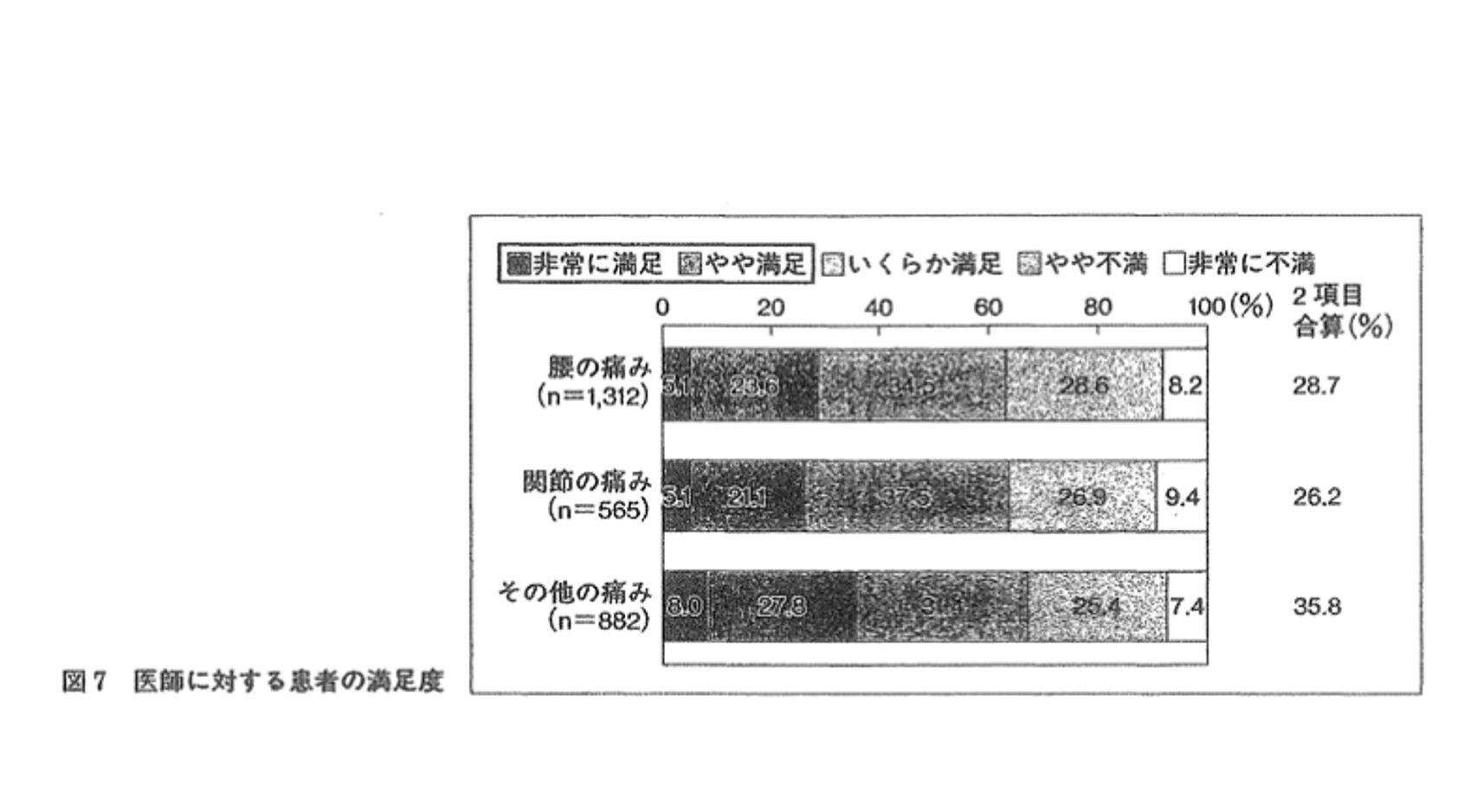 診療の結果、医師に対する患者の満足度としては、80%程度の患者さんは不満であったと回答しました。この理由としては、薬物治療の第1選択薬はNSAIDsと呼ばれる消炎鎮痛剤なのですが、第2選択薬、第3選択薬として、欧米に比べ日本ではNSAIDs以外の鎮痛薬使用が少ないことも理由に挙げられます。